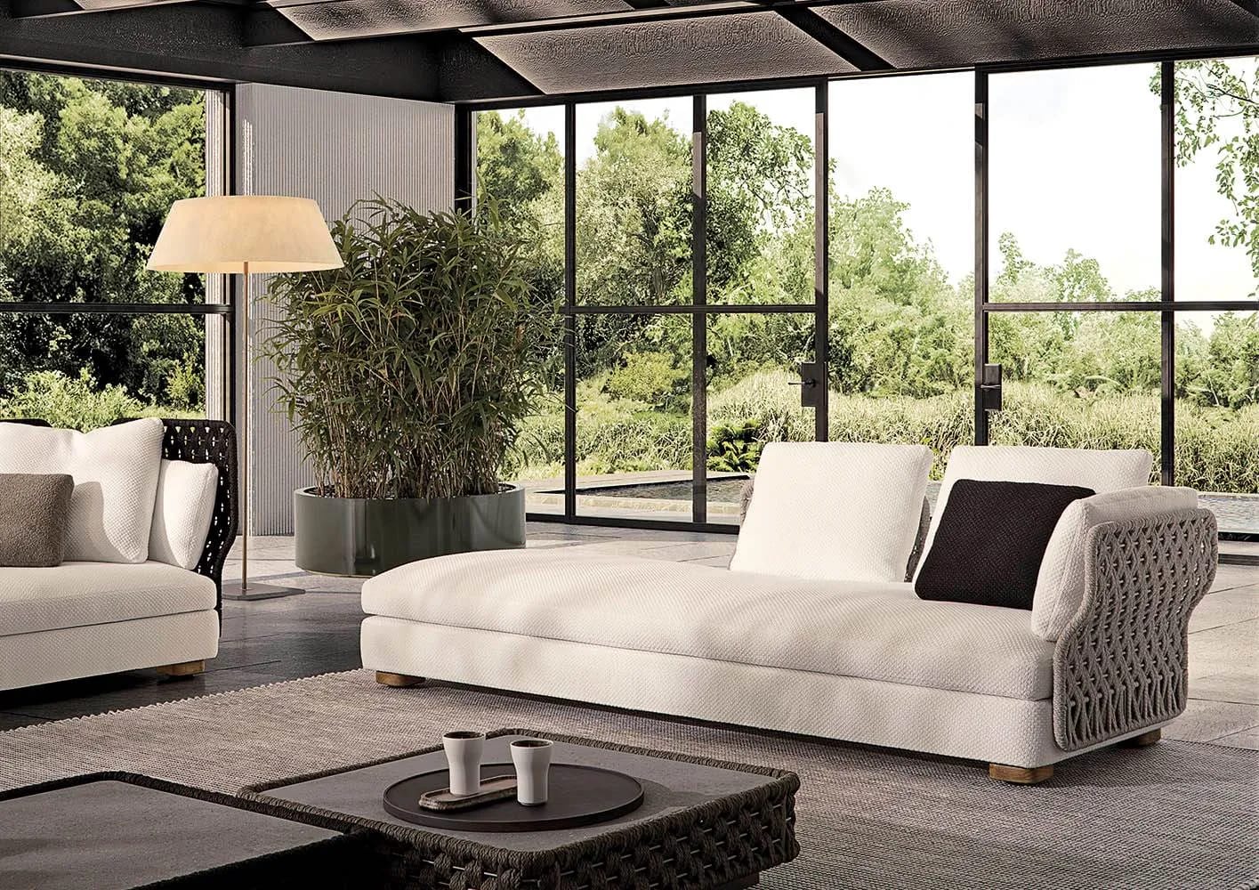 A seating system designed for outdoor spaces inspired by and named after an enveloping net that embraces and shelters. Raised off the ground by teak feet, Amii features woven cord panels that draw backrests and armrests in a harmonious S-shaped curve, gently cradling cushions of different forms and sizes that can create multiple, comfortable combinations. In addition to the standard cushion in three sizes, the cylindrical, spherical and disc-shaped cushions add flexibility to the system, and are conceived to provide maximum comfort when relaxing in the open-air. Amii caters for a wide variety of tastes and ergonomic needs: the low-backrest configuration is particularly suitable for convivial occasions, while the high-backrest version creates a more intimate and cosy space. The mix of the two types lends the atmosphere versatility and aesthetic movement. The woven cord of Amii also define the frames of the coffee tables and storage ottomans - the latter also available on wheels - which enrich the entire design, making it ideal for open-air living.