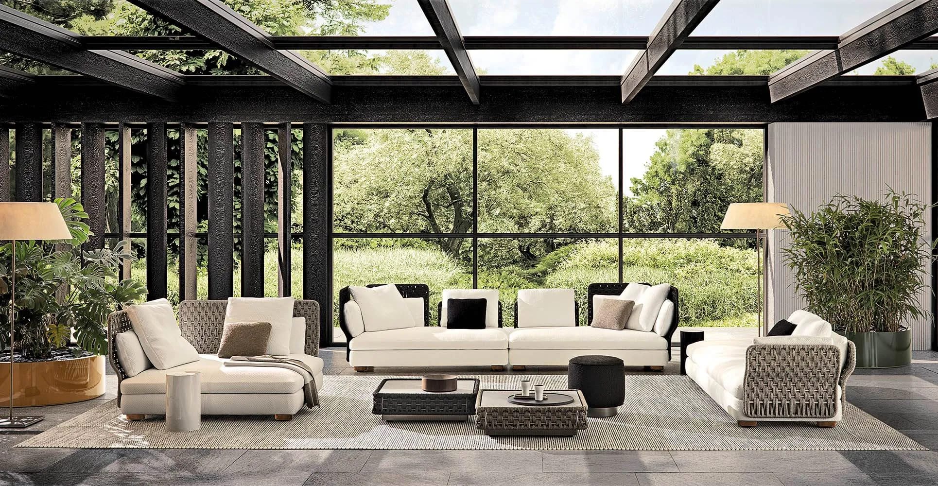 The design root of the Amii outdoor seating system inspires functional coffee tables. An ideal solution for the diverse requirements of open-air living spaces, the Amii coffee tables are distinguished by their varnished, stainless-steel frame – covered in woven cords in the colours Ecru, Bronze and Dark Brown – which accommodates a top in Basaltina stone or back-painted glass in the shades Celadon, Cappuccino, Rust and Green.