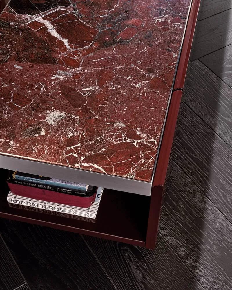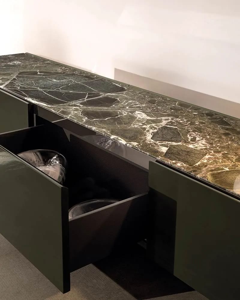 With its sculptural, reflective volumes, Jason is a family of storage units that combines functionality and decoration. A design that stands out for its distinctive trapezoidal shape, with the two tilted ends of the frame becoming storage compartments. Its elegant and modern silhouette ensures a great impact, as does the mix of different and exclusive materials that characterises its construction: the exterior is in fact embellished with a glossy lacquered finish, while the top, in wood or marble, is embedded in the visible steel frame. Jason rests on the ground on large stainless steel discs, which create a striking visual effect, giving it a strong personality. Available in different sizes and configurations, this family of storage units is designed to complement a variety of spaces, proving to be a timeless, classic furnishing piece.