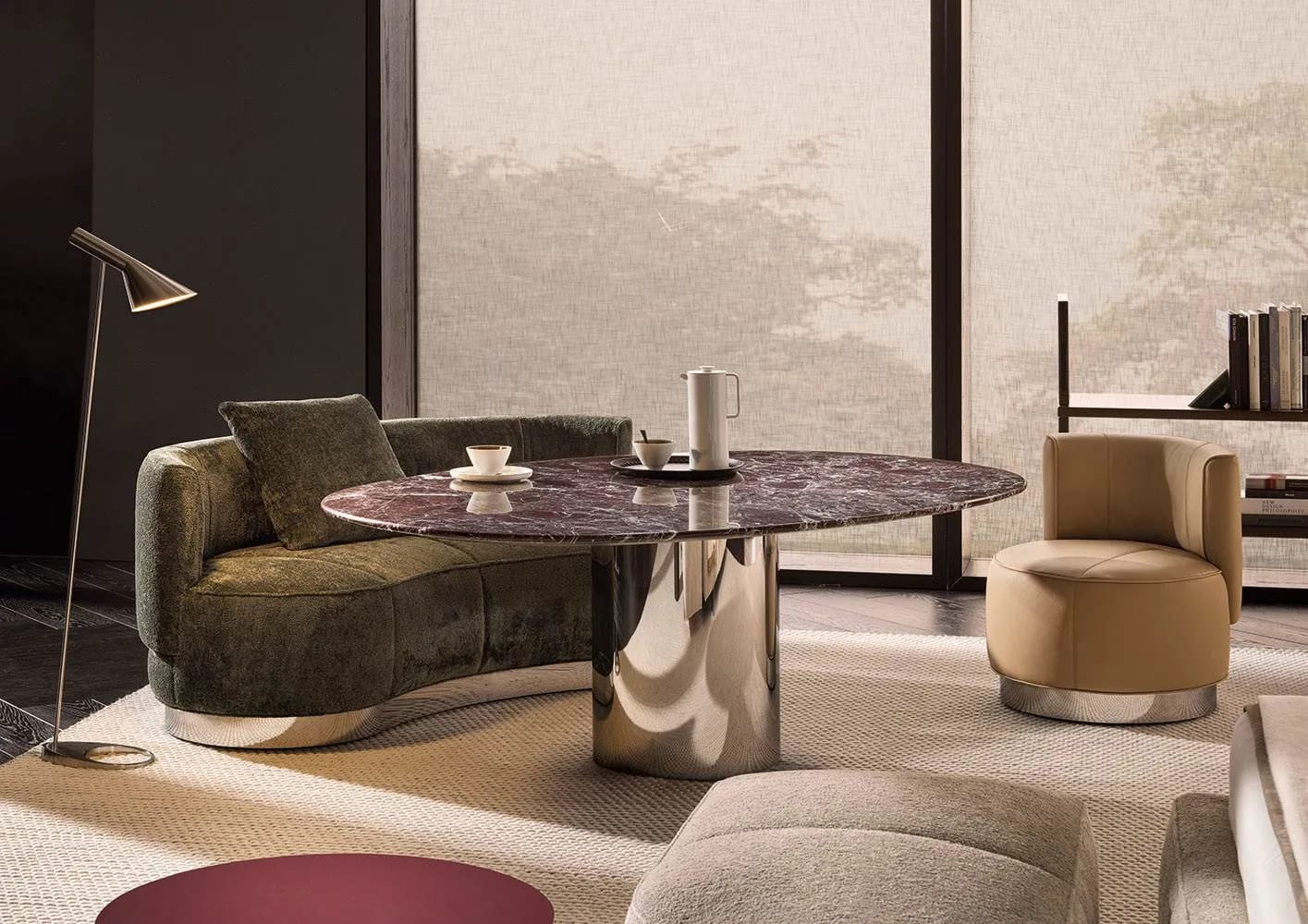 A family of tables designed for lounge settings, which reinterprets the space dedicated to relaxation, ideal for informal dining moments. Conceived to perfectly complement the Yves seating system, Rayan fits into the curves of the sofa, creating a convivial atmosphere. A furnishing piece that easily takes centre stage thanks to its cylindrical base in mirrored stainless steel or Black Coffee metal, on which a rounded elliptical top in marble or wood rests. Available in the dining and lounge versions, Rayan is extremely versatile and fully expresses the classic contemporary value characteristic of Minotti’s DNA.