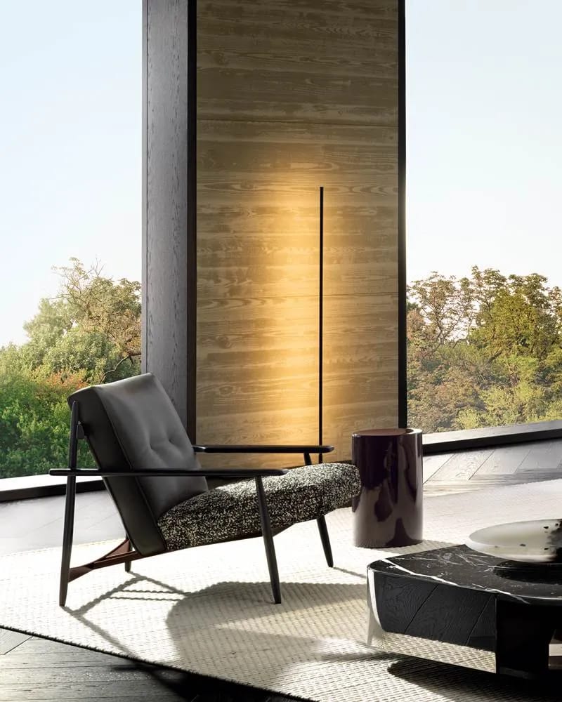 An armchair with a clear Brazilian twist in which the rationalist design of Marcio Kogan / Studio MK27 joins Minotti’s manufacturing know-how, bringing out the skilful and combined use of three different materials - leather, fabric and wood - for the seat, backrest and frame. Hence the name Trio. This slender and aesthetically light, yet solid furnishing piece accommodates a sophisticated padded seat and backrest featuring exquisite craftsmanship, that meets the typical refinement of Brazilian cabinet-making in the multi-sectional woodwork of the frame. The pleasant comfort of the seat and the tactile sensation provided by the polished armrests offer an evocative sensory experience, naturally echoed in the Trio Outdoor version designed for open-air spaces.