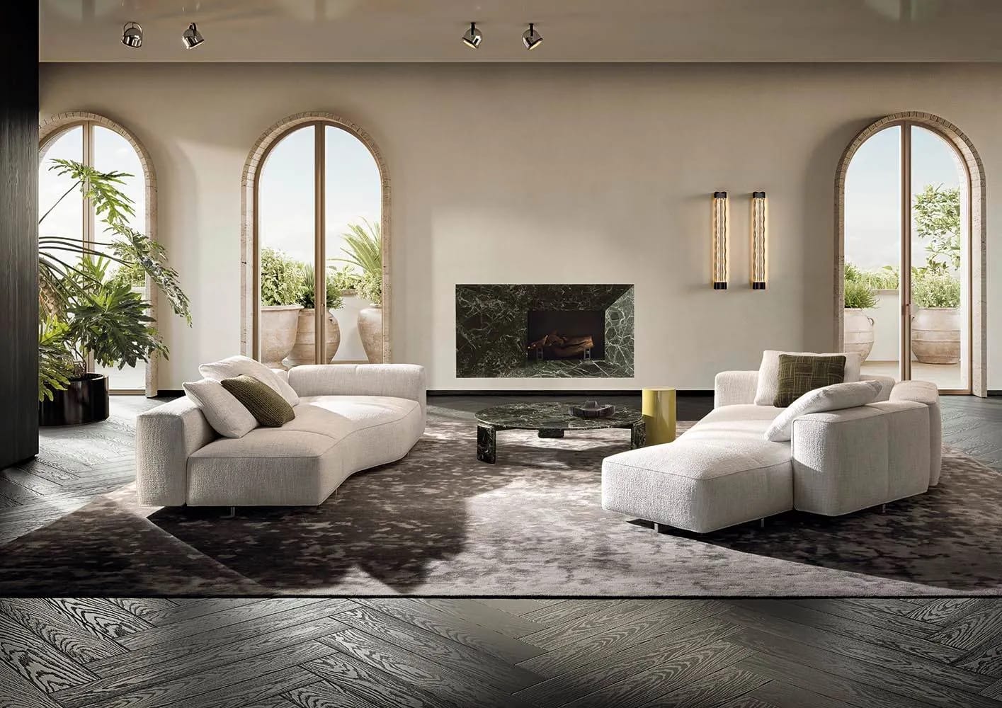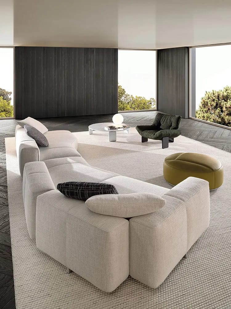 A combination of rigour and sinuosity, form and function: Yves is a seating system with a dual soul that reveals itself as an ideal synthesis of rational volumes and organic shapes, enriched by unexpected and dynamic tailored details. A project imbued with an intangible charm that transports us to the heyday of the 1970s. The flowing movements of the one-piece seats create different depths, resulting in cosy configurations: like coves, spaces open up to accommodate a small table or an ottoman, adapting the sofa to the constant evolution of contemporary living. The backrests support the curves of the seats, following their course with their segmented architectural shapes to form a gap, allowing them to be consecutive without appearing monolithic. This continuous change of flow is harmonised by unprecedented tailoring: asymmetrical seams give rhythm to the volumes, shaping the design and becoming an integral part of the architectural language, even dictating the unusual position of the aluminium feet, placed in correspondence of them. The tailored graphic elements, distinctive features of the system, are combined with the sinuosity of the shapes, characterising Yves as a domestic landscape: a piece of furniture capable of transforming traditional modularity into unique and innovative configurations, that are lively and asymmetrical, but at the same time reassuring and comfortable. The dynamic compositions also feature two different types of seats: one with a cushion, with a more traditional character, and one with a single-piece seat, that gives Yves a more contemporary look.