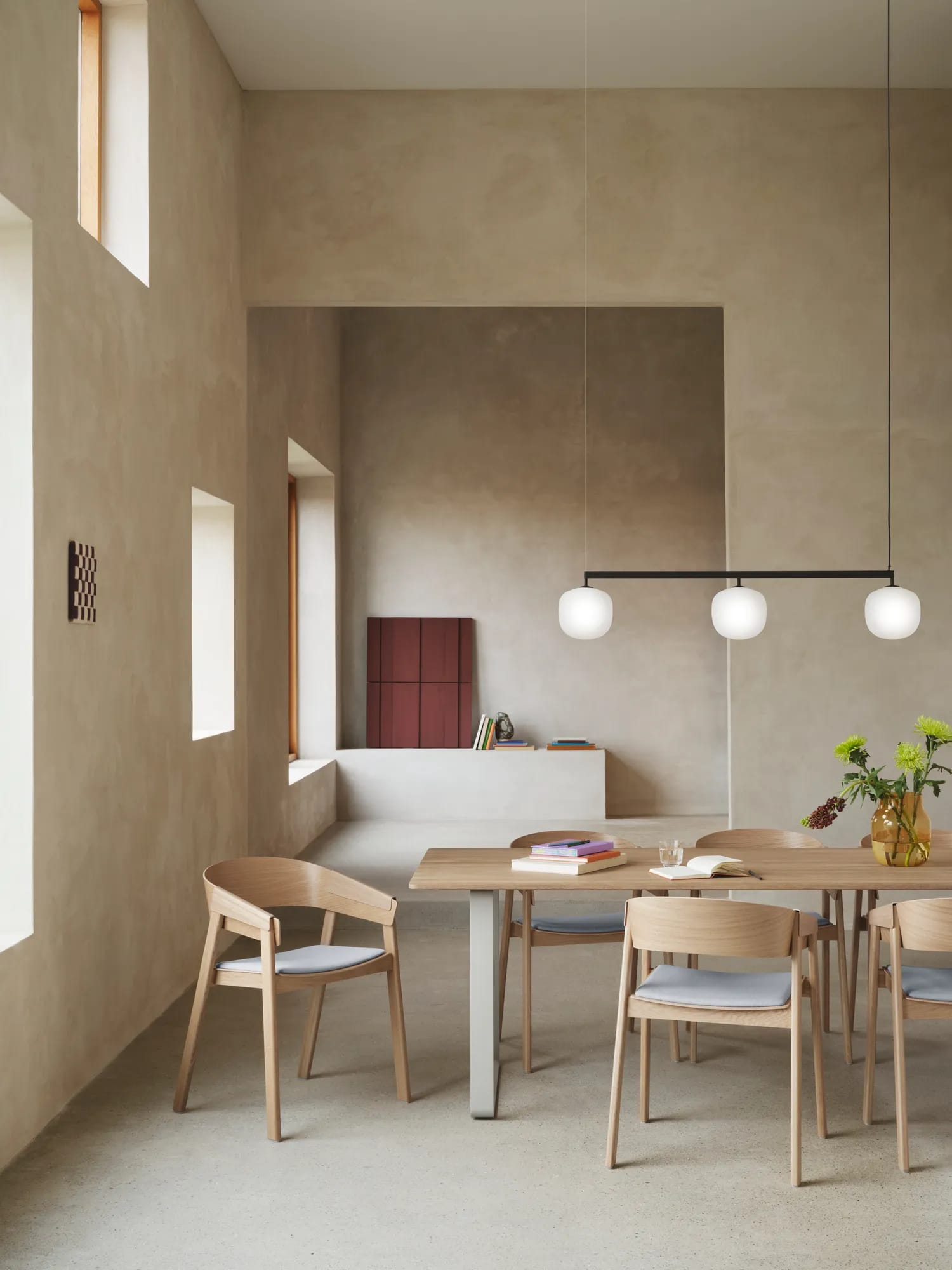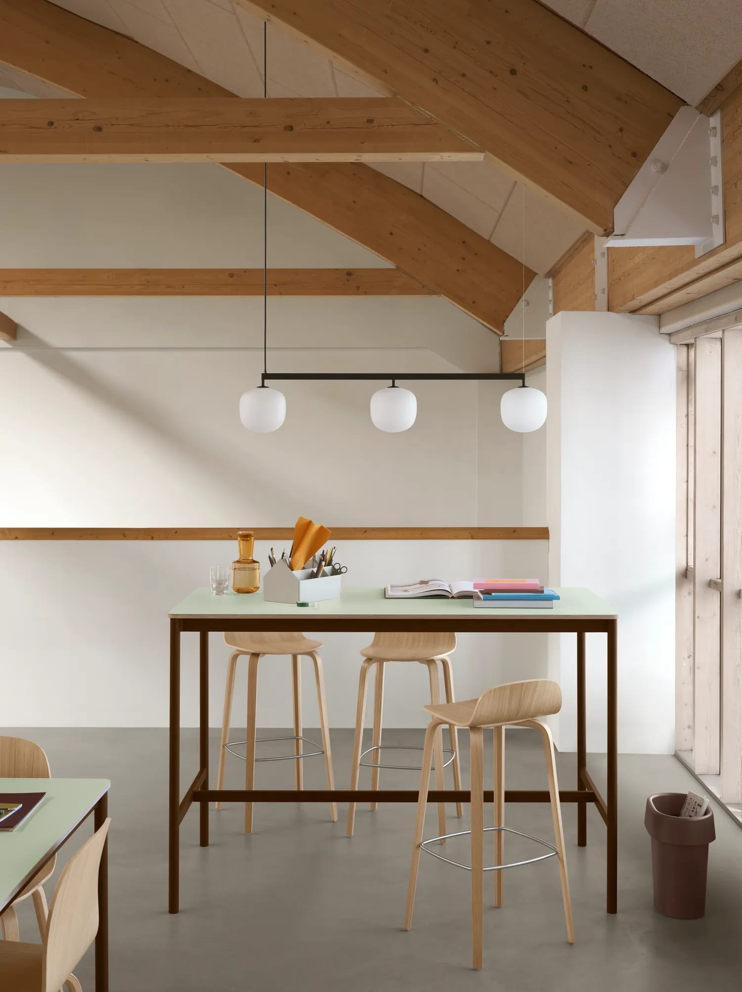 The Rime Rail Lamp creates a rhythmic interplay of light, linking three Rime lamps in a seamless composition. Its softly diffused glow and uniform illumination shift focus across the space, balancing function and atmosphere. Mouth-blown glass and a durable powder-coated rail add depth and tactility, making it a refined yet striking presence above dining tables, kitchen counters, and conference rooms.