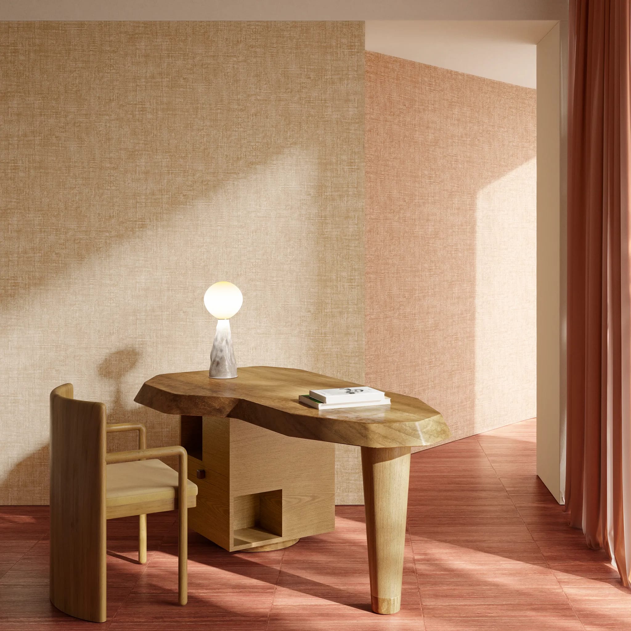 This plain wallpaper is named after the brushed suede painting technique, where paint is applied to the wall in specific patterns to create a soft suede look. The result is fantastic, but the process can be very time-consuming, labour-intensive and complex. This original wallpaper now offers a perfect alternative with the same artisanal look. What’s more, it’s much easier to apply. The paint used in the printing process is so concentrated that it looks as if it has been directly applied to the wall.