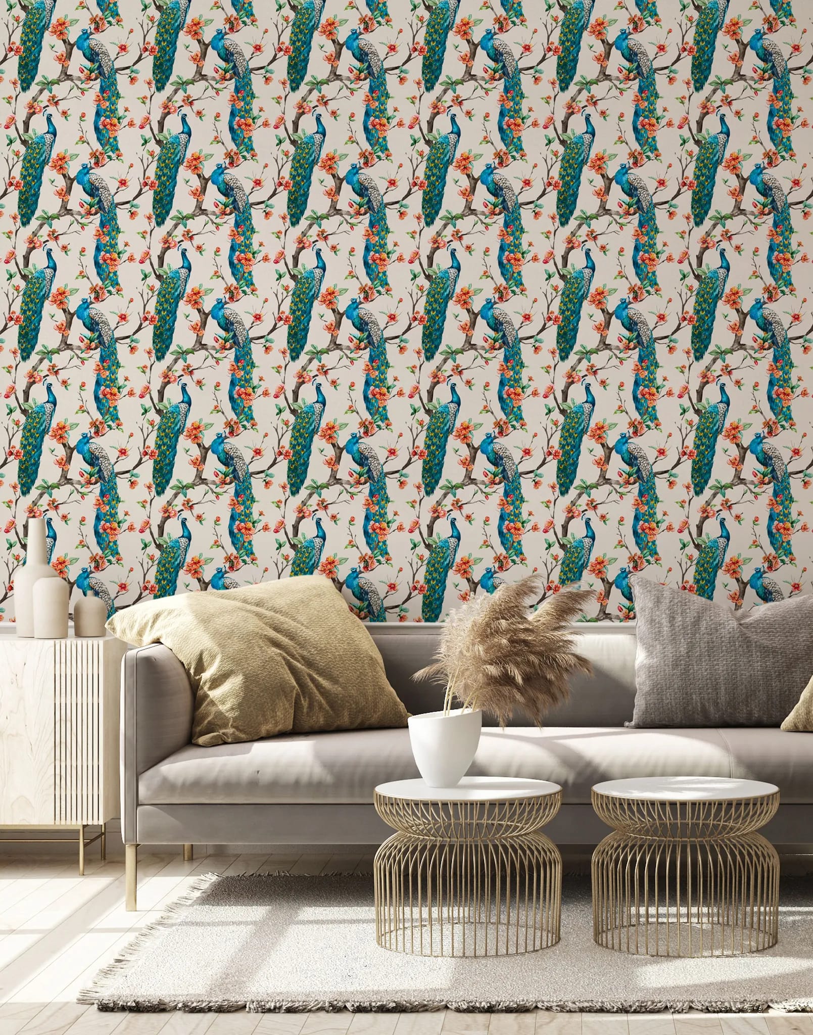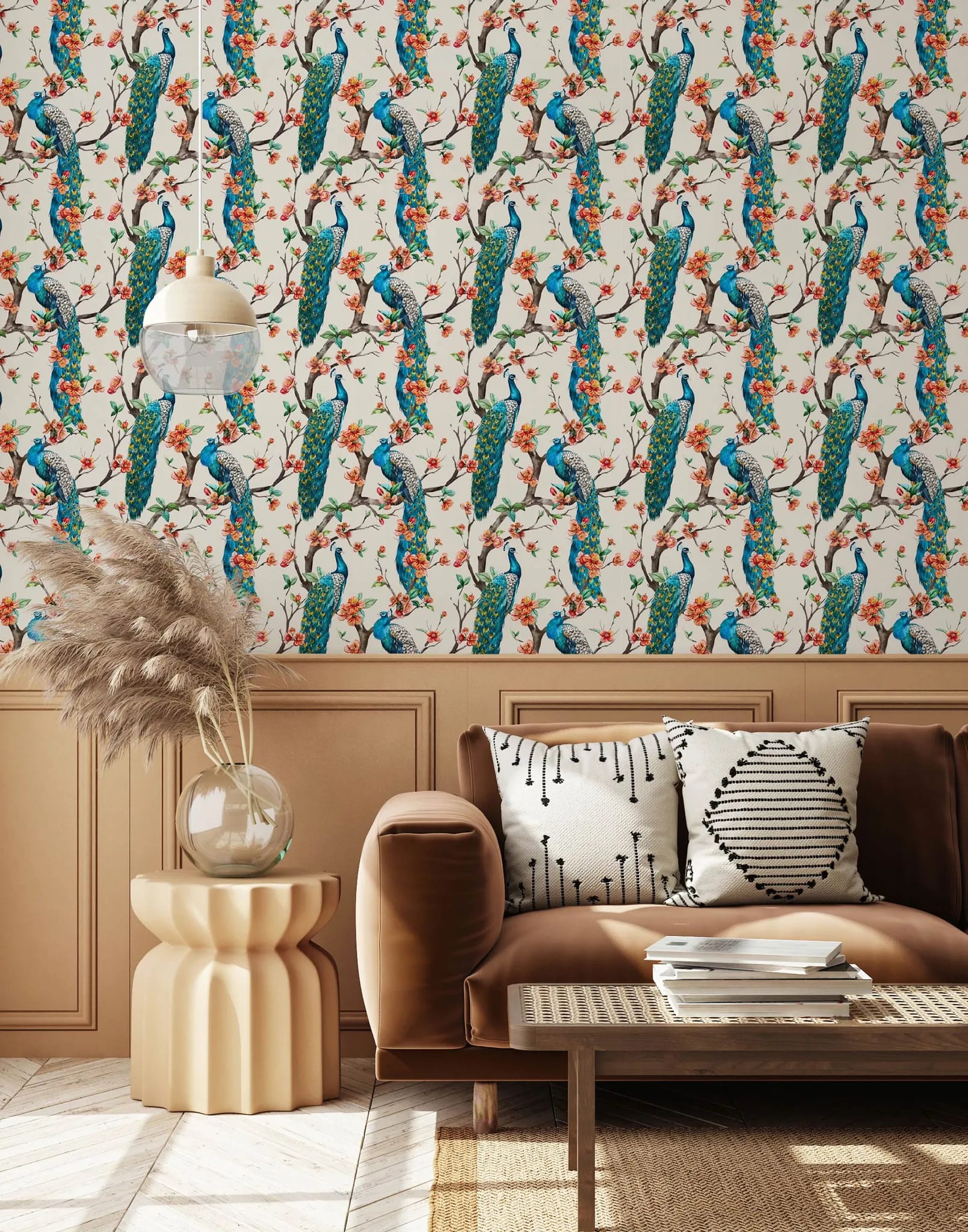 This hand-painted peacock pattern is rich with detail and suitable for those who are looking to make a bold statement with their decor. It's ideal for maximalist settings, pairing well with other rich patterns and colours.