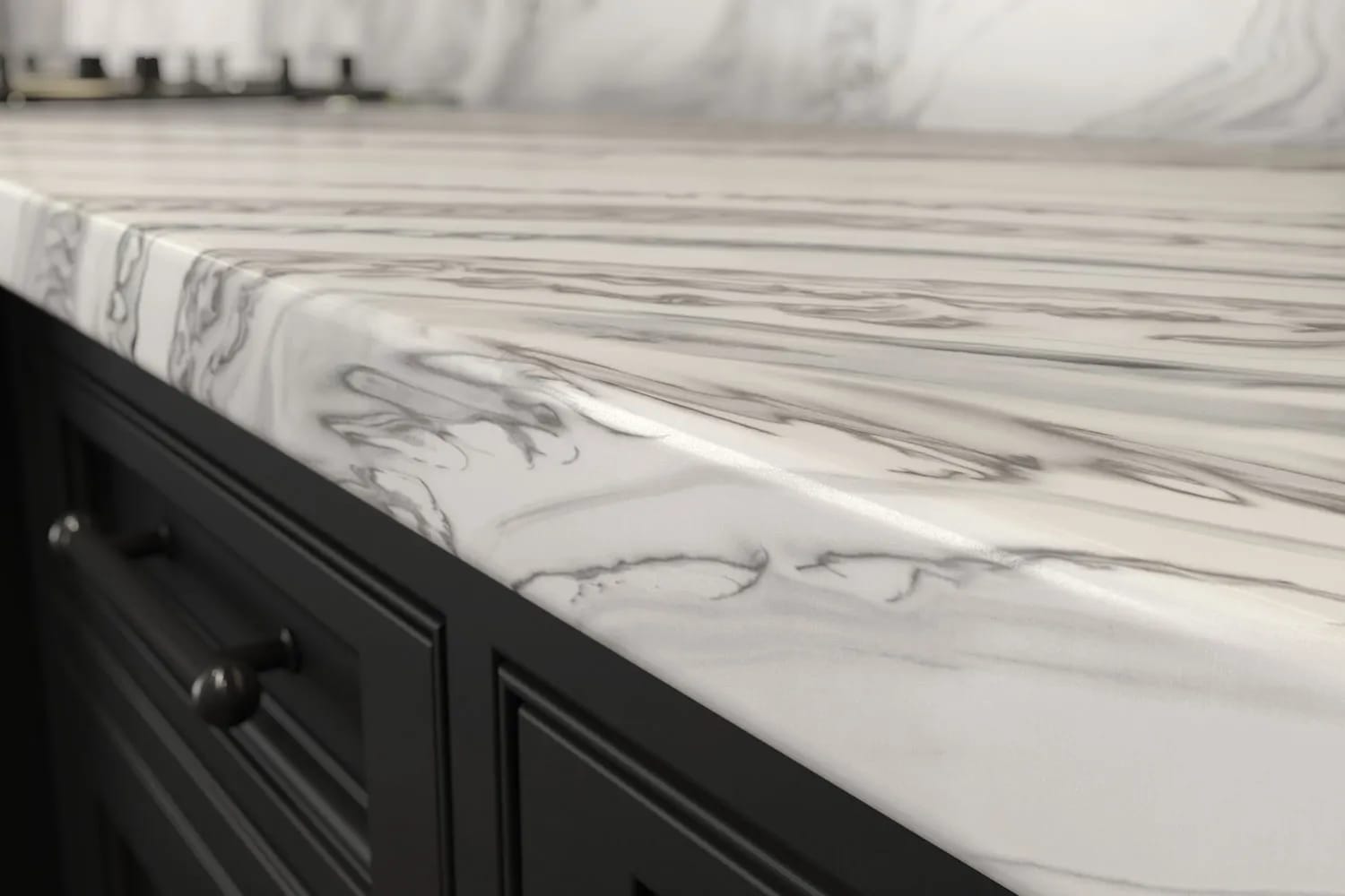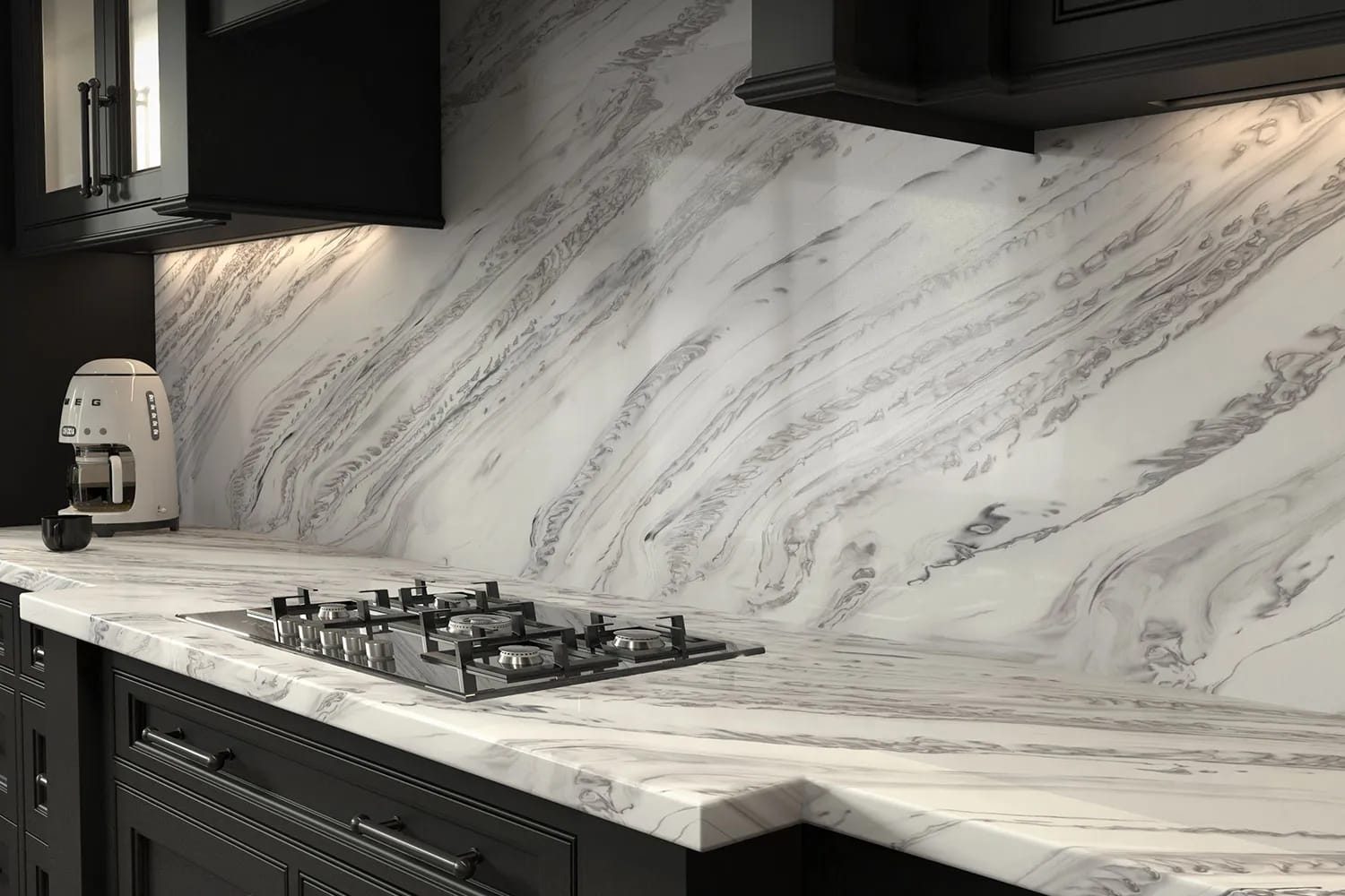 Bold and intense, the Glacier White background bursts with various gray veins and elements for a daring marble like aesthetic.