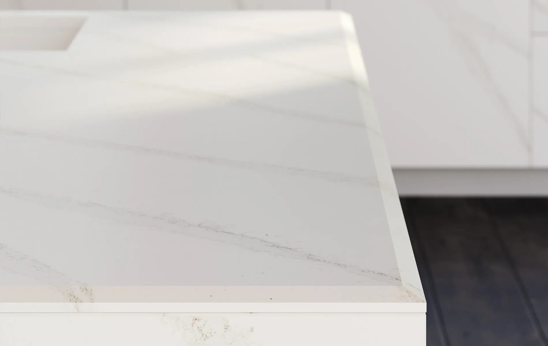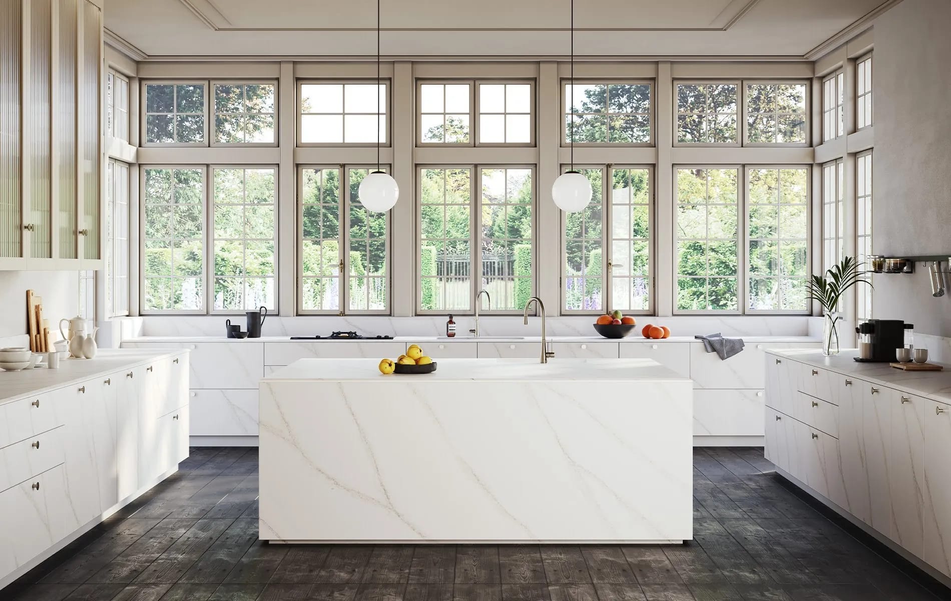 A pure, white Bianco Assoluto base and geometric veins in light grey cut the XXL format of the slabs in two, giving rigour and consistency.