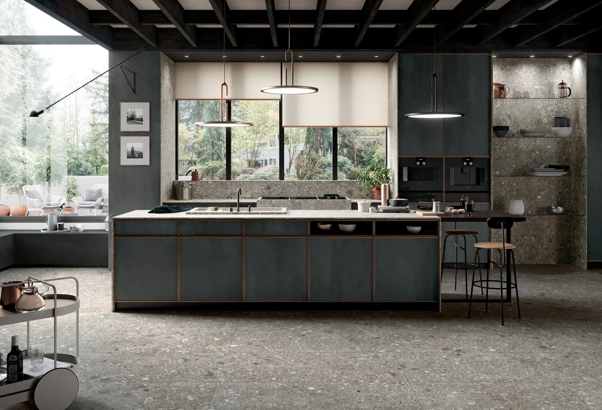 A material characterised by a harmoniously irregular grain, pebbles of different colours and sizes, and colours with a three-dimensional effect.
