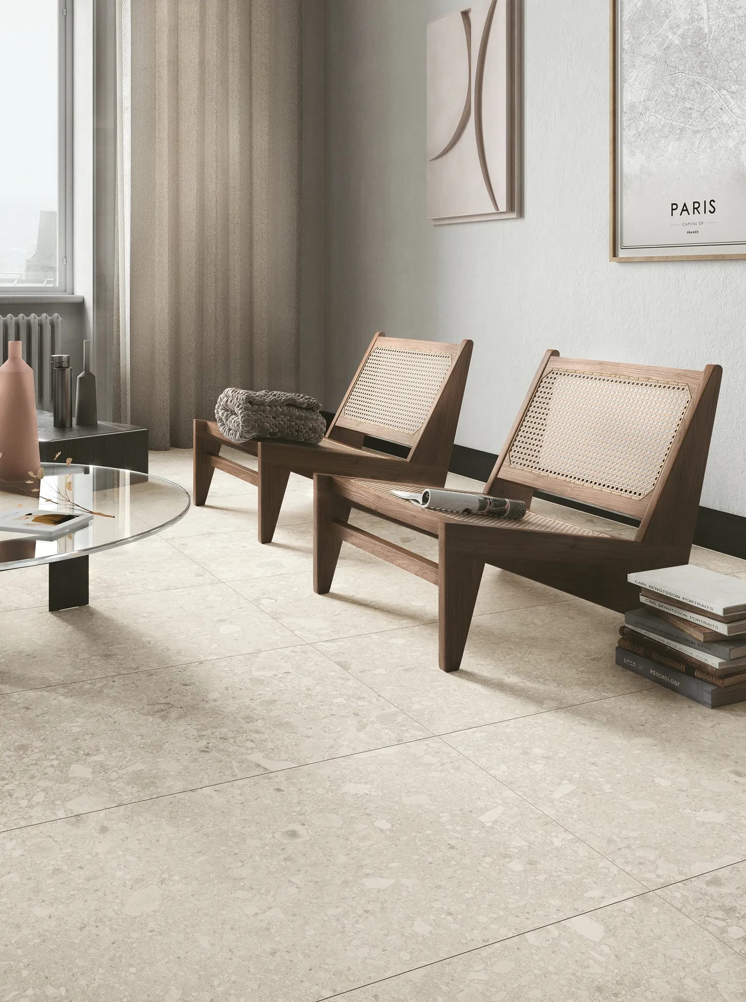 A material characterised by a harmoniously irregular grain, pebbles of different colours and sizes, and colours with a three-dimensional effect.